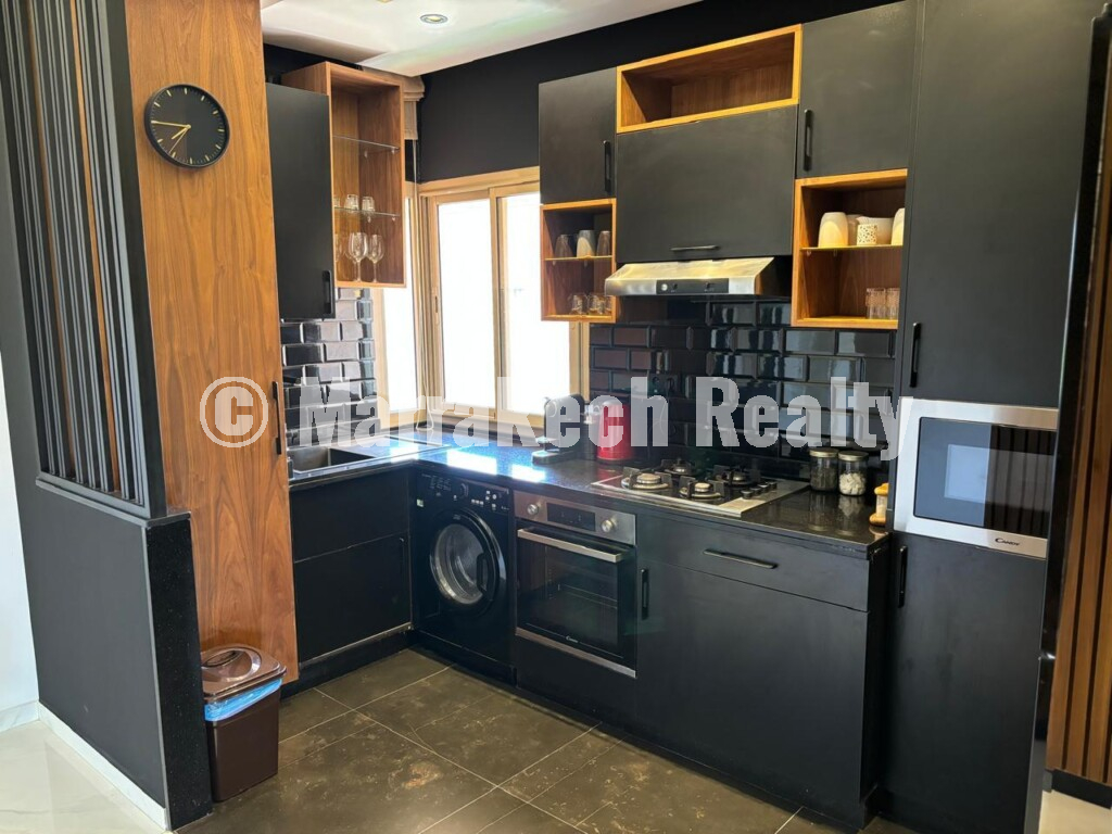 La cuisine ouverte, moderne et entièrement équipée, s’intègre parfaitement à l’espace de vie principal, alliant esthétique et praticité dans un esprit contemporain, pensé pour répondre à un usage quotidien aussi agréable qu’efficace.